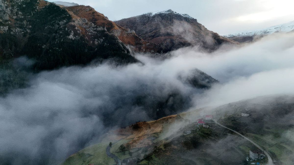 Santa zirvelerde oluşan sis ve bulut deniziyle sonbahar güzellikleri, drone kamerasına görüntülendi.